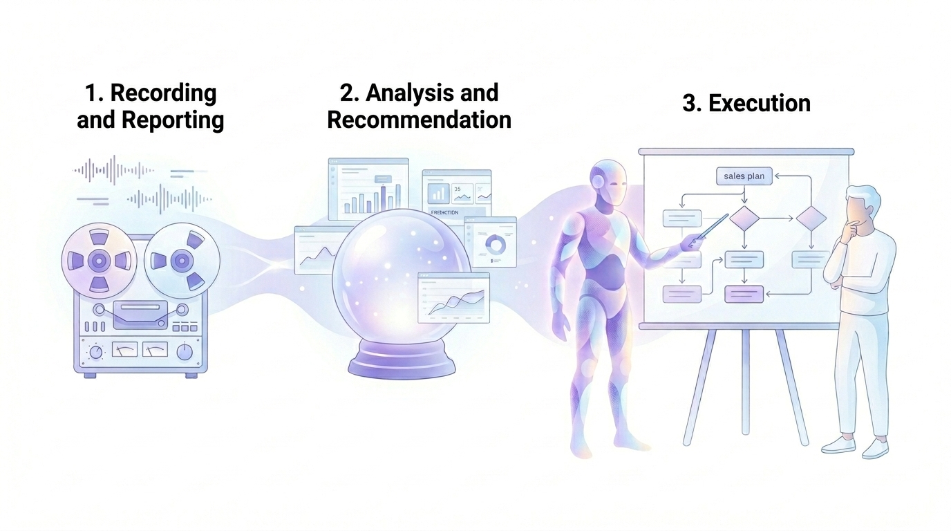 Where most of the market still sits. AI records your calls, transcribes them, and generates summaries. Products like Gong pioneered this space and built a massive category around conversation intelligence. The value is real: you get visibility into what is happening across your pipeline.